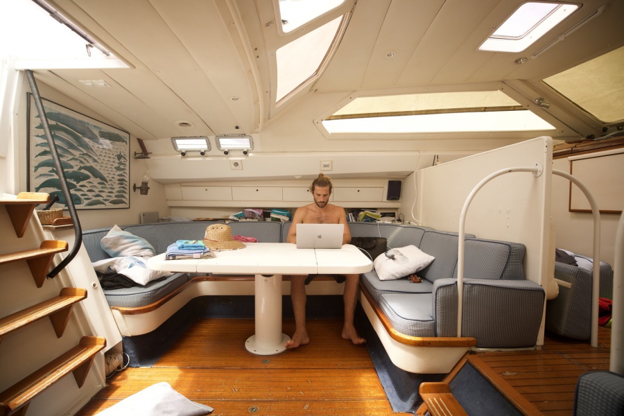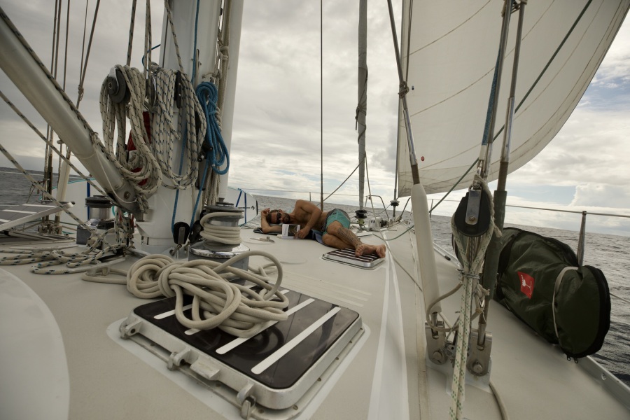 Même si le rythme est ralenti, j'essaye à tout prix de rendre chaque journée productive, cuisine, ménage, dérushage, montage, écriture carnet de bord, sport. Il n’y a que comme ça que je suis satisfaite et Alex aussi. Même en traversée, il y a ce besoin d’être « productif », efficace, je me dis que tout ce que je ne fais pas maintenant, je devrais le faire plus tard, alors utilisons tout ce temps libre pour pouvoir profiter plus tard des mouillages ou des amis à Paris. Cédric n’est pas du tout dans la même logique. Ce qui le satisfait, c’est de regarder la mer. Pendant des heures. Parfois un peu de musique, et encore… Il ne s’ennuie jamais. Il est comblé par le simple fait d’observer l’horizon. Il se compare à une tortue qui hiberne, qui prend le temps. Il nous observe aussi nous agiter, avoir toujours quelque chose à faire, cela doit le fatiguer!