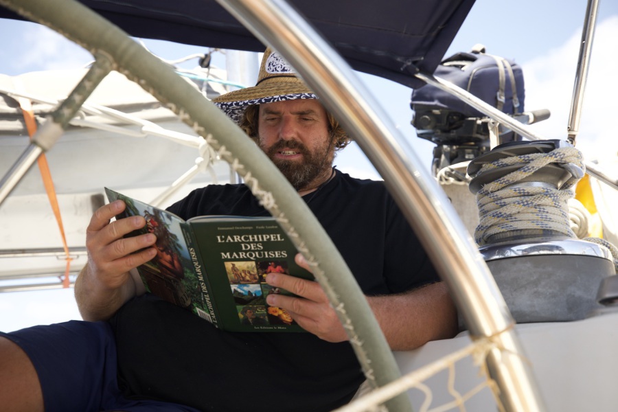 Alex a hâte d’arriver surtout pour socialiser à nouveau, il se demande si nous allons retrouver des connaissances au mouillage, se réjouit d’avance de parler avec les locaux. Mais il n’aura pas à attendre notre arrivée puisque nous allons croiser un premier voilier! Ce signe de « civilisation » agite tout le bateau et c’est l’événement de la journée! Alex et au taquet quand celui-ci nous appelle à la VHF. Il nous demande de passer à tribord car le vent a changé et il semble avoir peur qu’on lui rentre dedans! Alex commence à engager la conversation, vous venez d’où? Blablabla…Sauf que le type coupe court à la conversation et n’a visiblement pas trop envie de discuter. C’est un couple d’allemand qui font un stop aux Marquises avant d’aller en Thaïlande…quel courage! Cette ébauche d’interaction humaine sera tout de même très satisfaisante pour Alex!