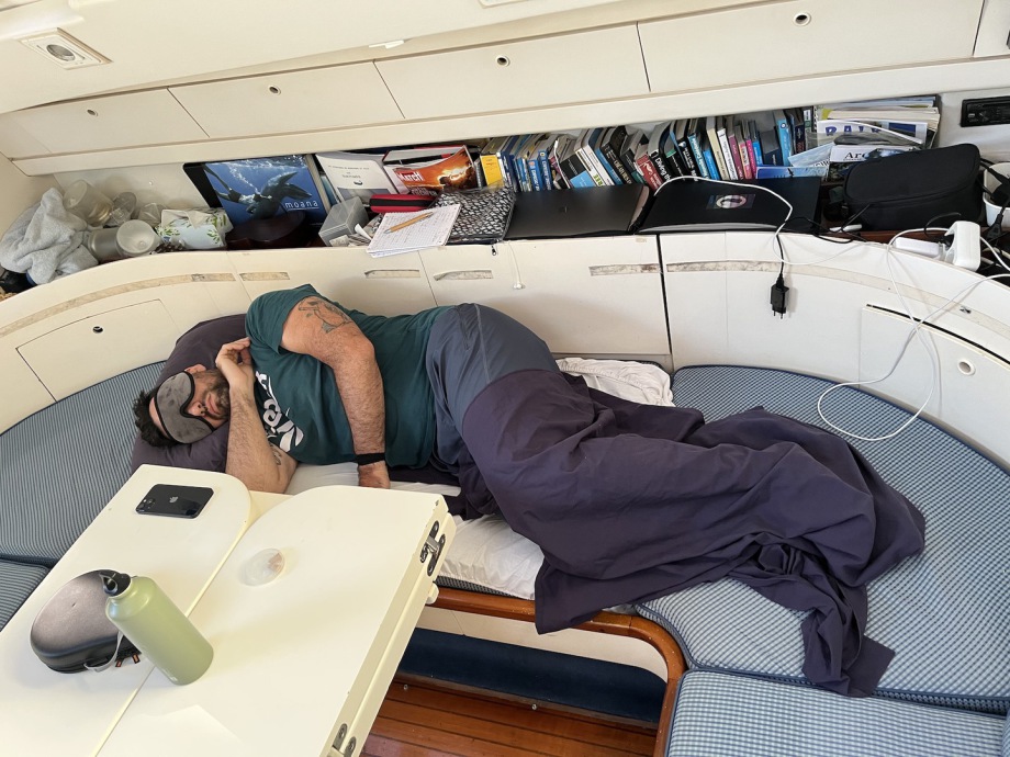 Morgan vient souvent dormir dans le carré car dans sa cabine il y a peu d’air surtout pour la personne qui dort en haut.