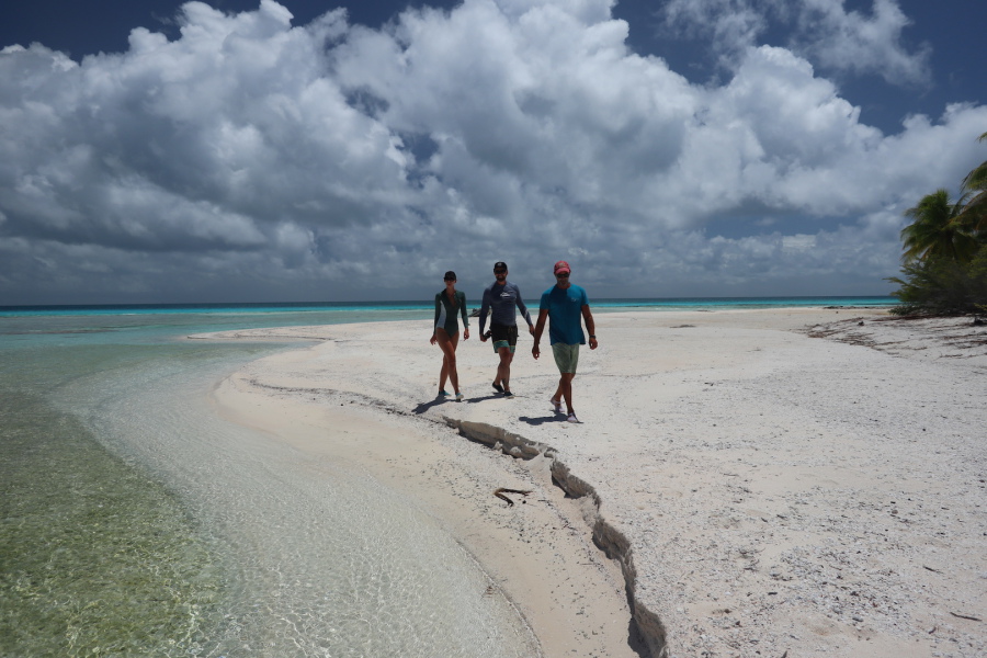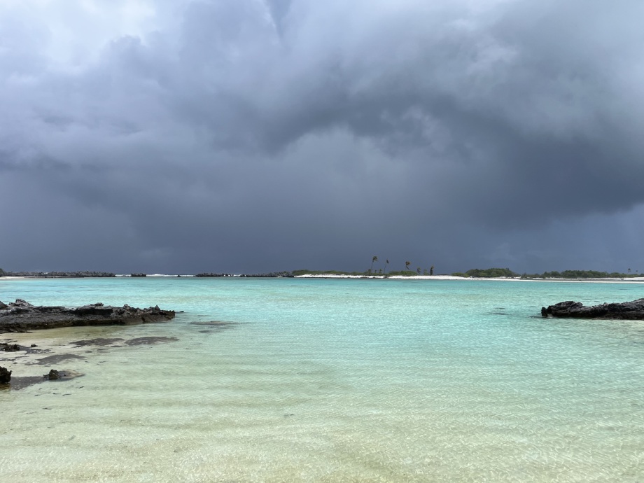 Nous partons ensuite tout au sud de l’atoll, à l’île aux récifs, Morgan se fait un plaisir de barrer durant les 5 heures de navigation.