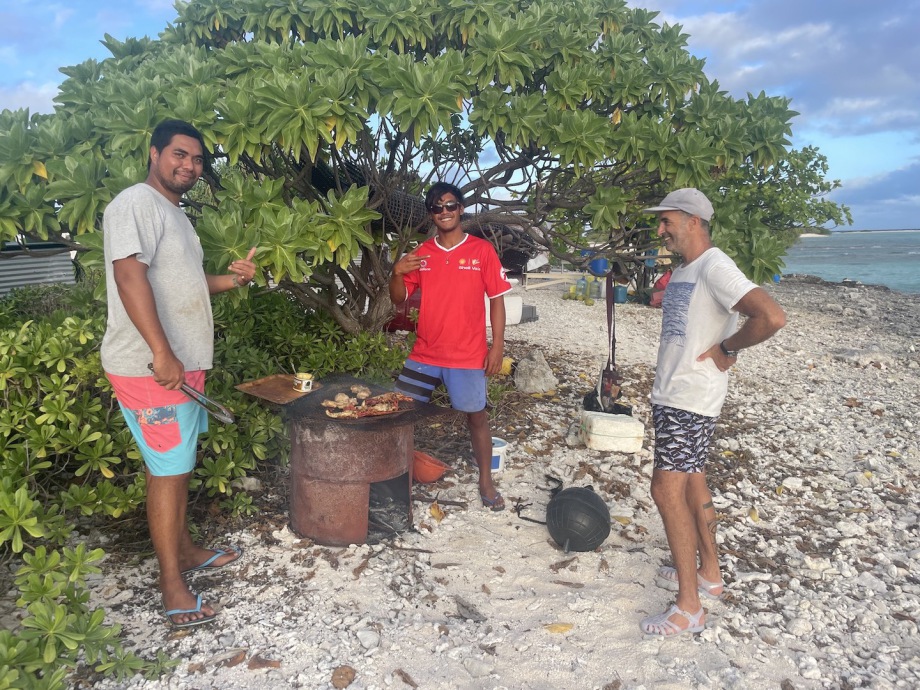 La famille polynésienne qui vit sur le motu d’en face nous offre gracieusement des firi firi ( des beignets )! Cela nous touche beaucoup! Nous les croisons tous les jours sur l’eau, ils pêchent non stop durant plus d’un mois, principalement des loches marbrées (des mérous), ces poissons que nous aimons tant observer. À chaque fois, ils nous montrent fièrement leur butin du jour en ouvrant une énorme caisse remplie de poissons morts tout en ayant une loche agonisante au bout de leur fil de pêche. Ils sont tellement gentils que je fais comme si de rien était alors que je suis au bout de ma vie. Je sais que c’est une pêche très sélective mais en un mois, ils nous disent avoir pêché plus d’une tonne de loches! Qu’ils vont revendre aux restaurants de Tahiti. Nous n’avons aucune idée de leur impact sur les poissons, est ce qu’ils pêchent 1 tonne sur 30 tonnes? Ou sur 5 tonnes présentes dans le lagon? Ce qui est sûr c’est que ces mérous vont se reproduire dans une semaine et en pêcher autant juste avant leur saison de reproduction ne me semble pas très judicieux. Cela n’empêche pas ces pêcheurs d’être adorables, ils nous disent préférer observer les tortues et les raies manta plutôt que de les pêcher.