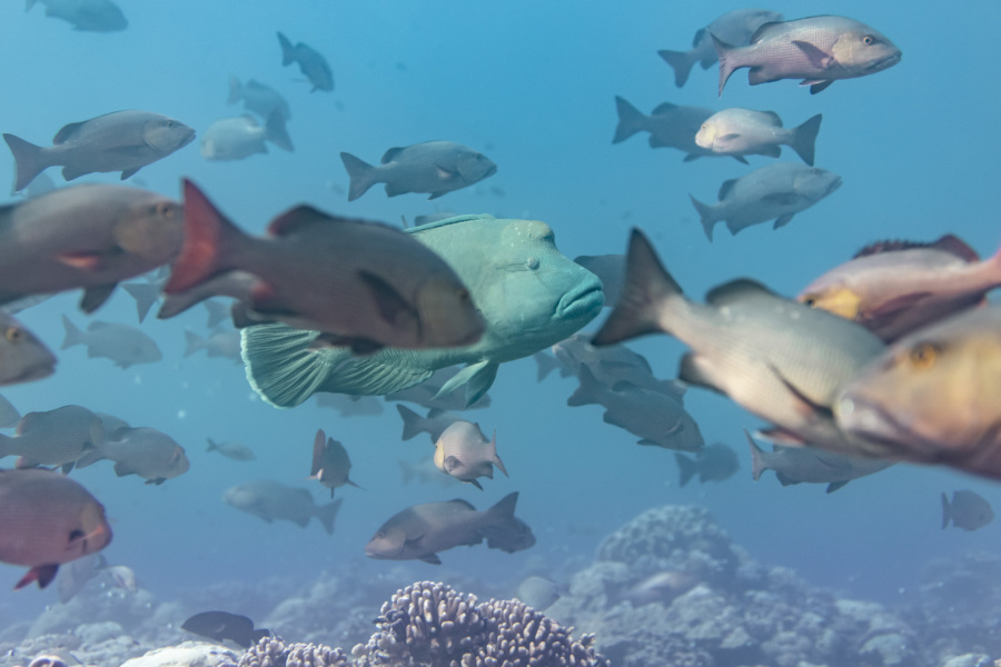 Nous sommes éblouis par ce que nous voyons: déjà une visibilité de plus de 30 mètres, des coraux d’une splendeur absolue, par leurs formes, leurs diversités et leurs couleurs. De très nombreux poissons dont certains assez rares, plusieurs espèces de requins, des raies manta… mais ce qui nous surprend le plus, c’est leur comportement: ils ne sont pas du tout peureux, ils sont même curieux et s’approchent facilement. Ils nous renvoient une belle image de l’être humain, autre que celle d’un prédateur ou d’un perturbateur.