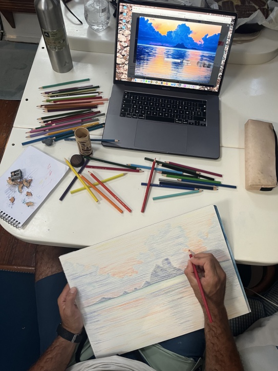 Nous allons rester un long moment dans ce mouillage loin de la ville que nous adorons. Nous irons très peu à terre. Chaque jour est le même, la matinée j’écris mes carnets de bords et Alex se réveille doucement. Vers 11 heures, grande nage au milieu des sublimes patates de corail que je qualifierai de « féériques ». Nous déjeunons en observant les bateaux autour de nous non sans commentaire, puis, long temps consacré à la sieste et la lecture, et de nouveau les carnets de bord pour moi et bricolage pour Alex. Vers 16 heures, nous retournons nager et j’enchaine avec la danse ou la barre au sol pendant qu’Alex dessine. Diner devant Netflix avant d’aller scroller sur Instagram dans notre chambre. Une vraie vie de retraités qui nous fait vieillir avant l’âge: entre la sieste qui devient indispensable et le port des lunettes quasi obligatoire pour lire nos messages sur le téléphone!!!