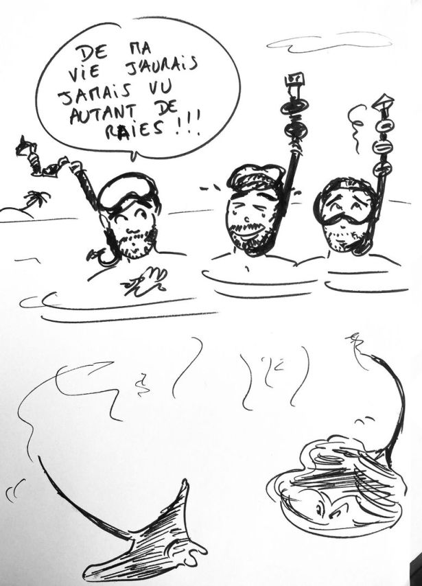 Nous adorons ce nouvel endroit que nous ne connaissions pas! Nous allons immédiatement nager vers le récif, où les patates sont beaucoup plus nombreuses après un long banc de sable! Ce sera la dernière baignade de Vincent…il a rendez-vous cet après-midi pour un tatouage! Max hésite encore et a préféré décliner.