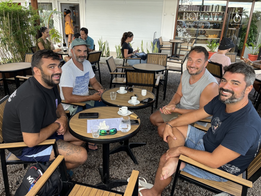 Petit arrêt chez le meilleur tatoueur de l’île! Vincent et Max ont bien envie d’un tatouage polynésien mais comme la baignade sera interdite après, il faut le prévoir juste avant de prendre l’avion . Ils n’ont pour l’instant pas de place mais nous tiennent au courant…