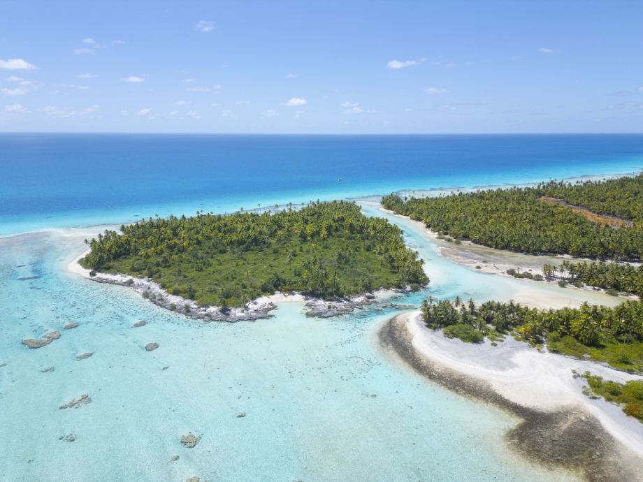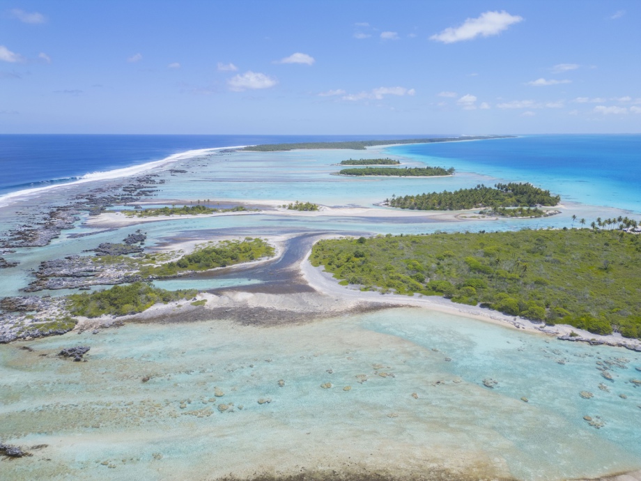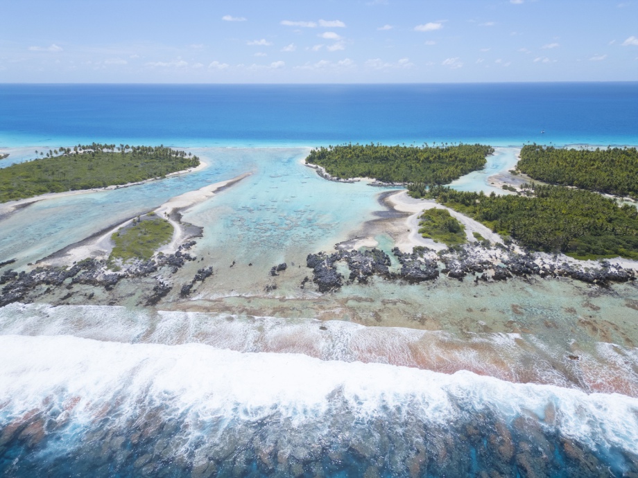 Au premier plan: l’océan, puis le fameux mur de corail surélevé, les motu et le lagon avec Diatomée (oui oui! Il faut zoomer!!)