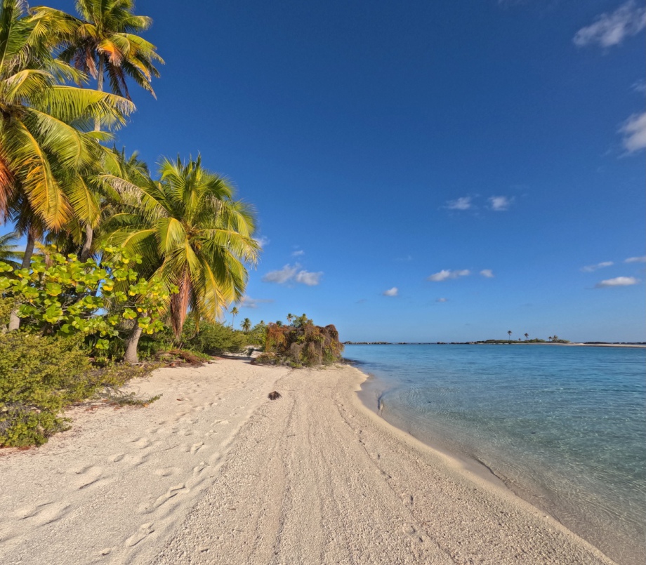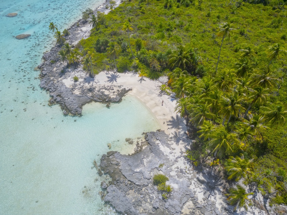 La petite plage vue de plus loin: en bas du motu arrondi.