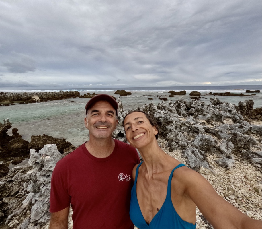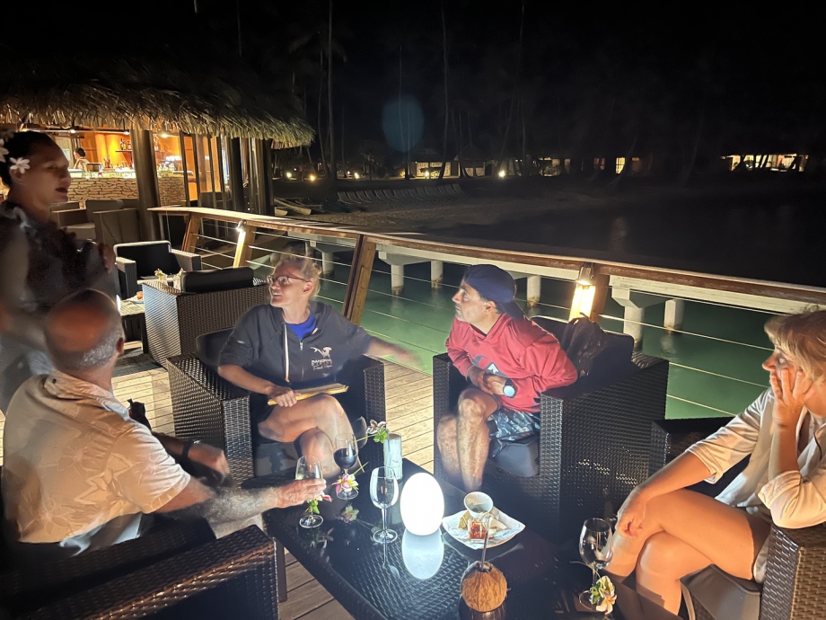 Avant de partir définitivement des Tuamotu, nous buvons un dernier verre avec Belen qui nous a tant aidé à faire nos images avec les dauphins mais aussi avec Martin et Pamela Carzon que nous étions ravis de connaitre davantage. J’avais vu Pamela à la télé il y a au moins 10 ans, elle expliquait son travail de recherche avec la population des dauphins à Rangiroa et je me souviens avoir eu des étoiles dans les yeux devant cette fille qui se consacrait à ces animaux sur une île du bout du monde!