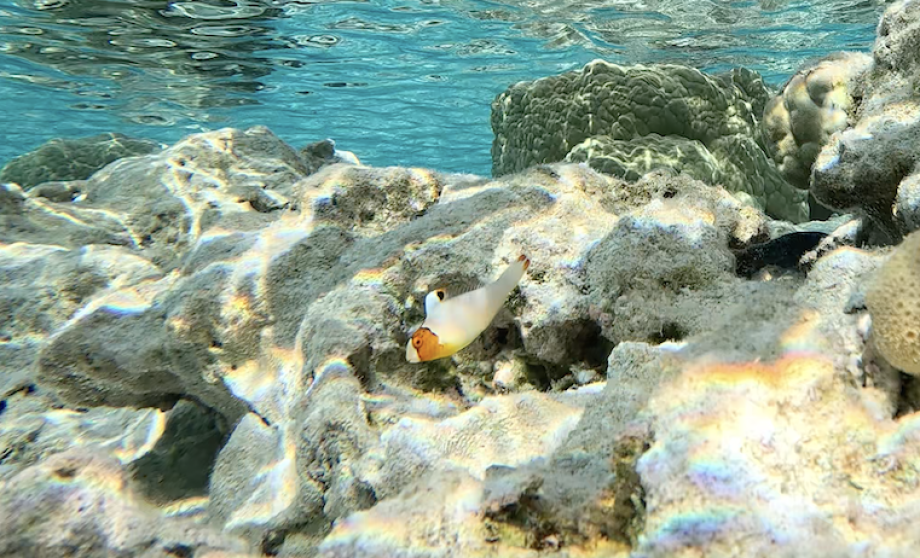 Le temps finit par se calmer un peu et nous pouvons profiter de cet endroit incroyable, et notamment découvrir un nouveau poisson! Cela nous arrive quelques fois mais pas tant que ça car nous finissons par bien les connaitre. Et un jour, une merveille vient surprendre Alex derrière son masque: une petite créature blanche et orange qu’on pourrait croire tout droit sortie de l’IA tellement elle sort de nulle part! Il m’appelle fort mais je n’entends pas et continue de nager. Quelques heures plus tard nous essaierons de retrouver ce petit poisson sans grand espoir, et après 30 minutes à explorer minutieusement chaque patate de corail, je reconnais immédiatement l’individu inconnu!!!!!!