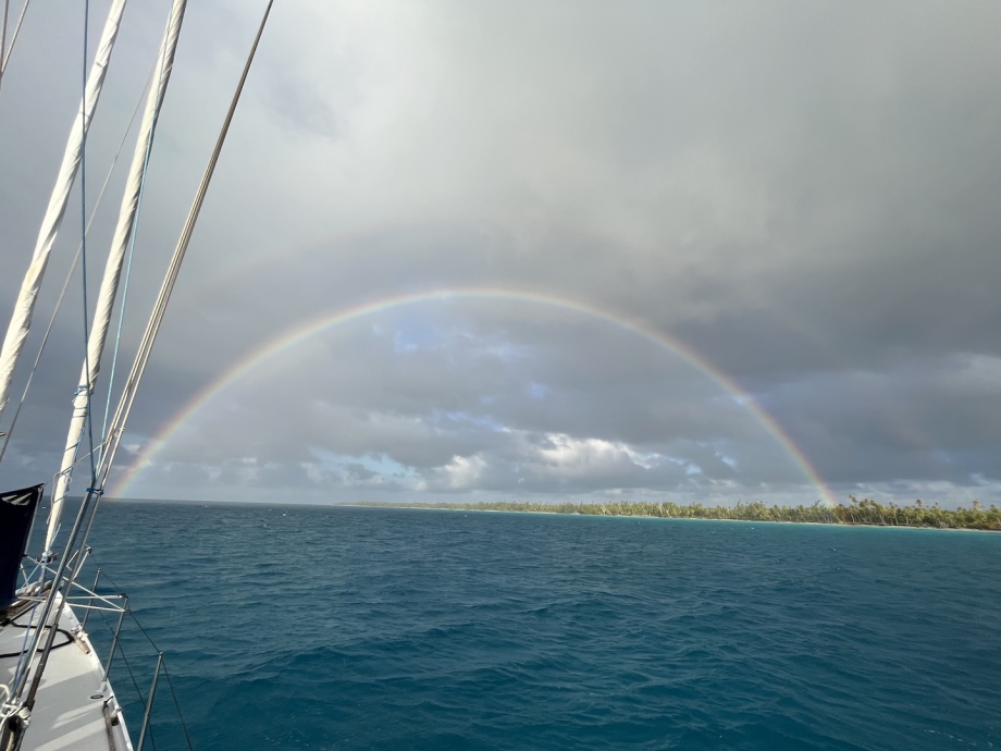 À cause d’un souci avec l’arbre d’hélice, nous devons utiliser le moteur au minimum: juste pour remonter et poser l’ancre. Nous sortons de la passe à la voile avec un énorme grain qui nous tombe dessus pile à ce moment là et des fortes rafales! Franchement c’est sport mais nous gérons grave! Nous allons hyper vite et si le vent continue d’être bien portant, nous serons peut être à Moorea le lendemain après-midi!