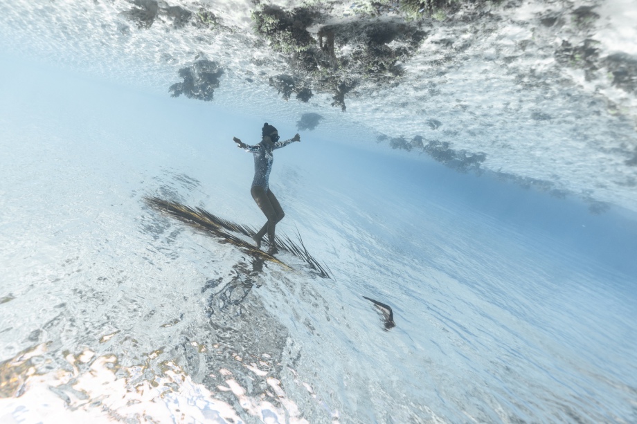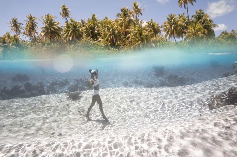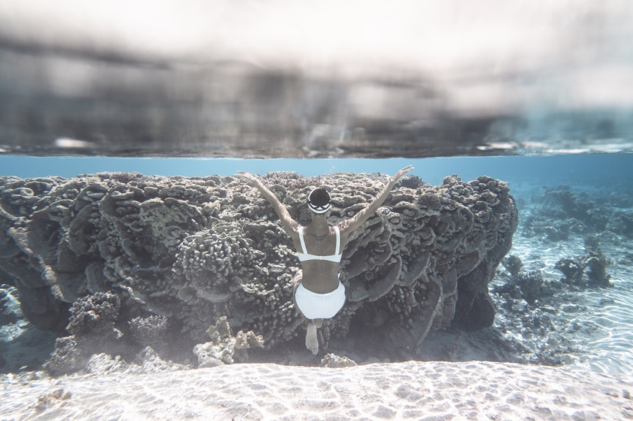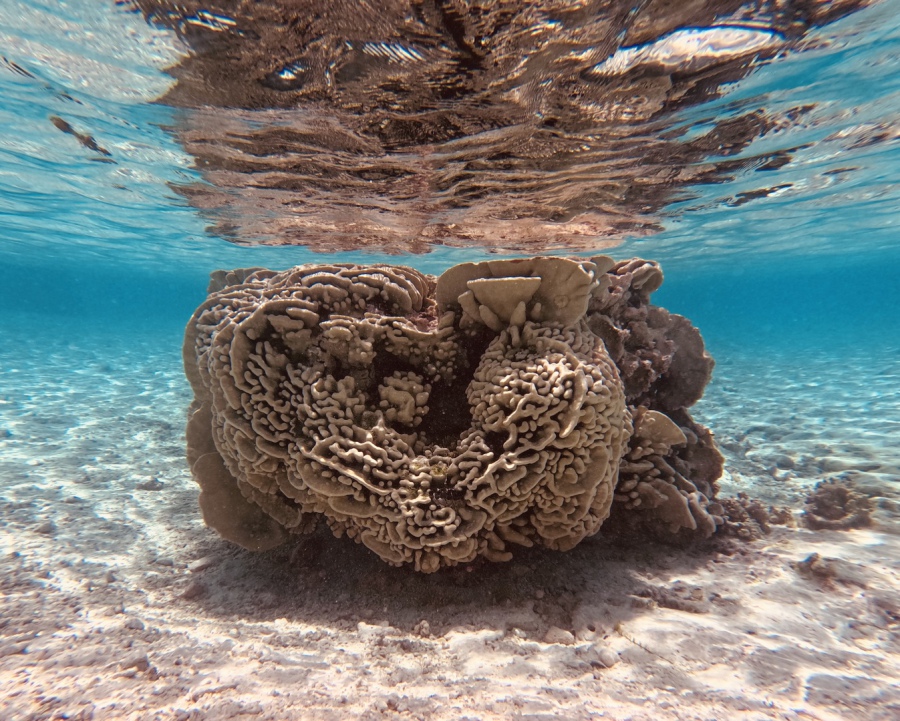 Nous allons explorer les Hoa à la nage: des chenaux qui séparent les motu et relient l’océan au lagon: ils sont très peu profonds mais sont traversés par un fort courant qui vient de l’océan et qui provoque une visibilité incroyable! Nous adorons y nager sportivement!