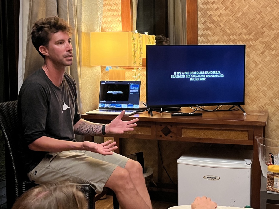 Steven Surina spécialiste des requins est de retour à Rangiroa avec un nouveau groupe de plongeurs et il nous invite de nouveau à sa conférence, cette fois-ci sur les interactions requins-humains, c’est absolument passionnant! À voir dans un futur vlog!