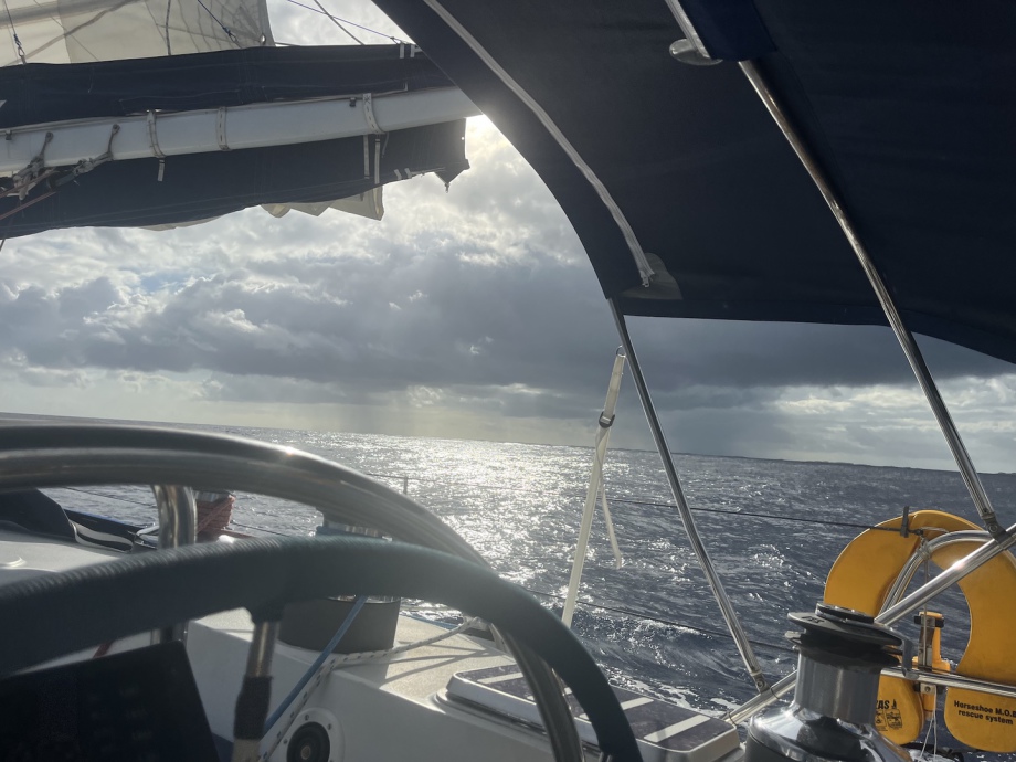 Mais la météo va vite venir gâcher ce beau spectacle avec une série de grains qui amènent du vent violent et des énormes vagues: le bateau bouge comme en navigation musclée! Je finis par être hyper malade et ne rien pouvoir faire d’autre que rester allongée à écouter des podcasts. Cela durera plusieurs jours, ce sera ensuite au tour d’Alex d’être malade… La plupart du temps il nous est impossible d’aller souffler quelques heures à terre tant les vagues sont énormes, nous ne pouvons pas accoster…