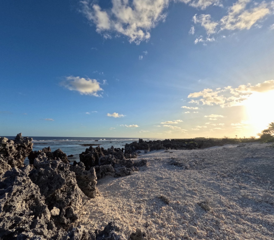 Après 4 heures de navigation, nous arrivons au sud de l’île, près des motu appelés « île aux récifs ». Sous l’effet du poids des îles de la société comme Tahiti, qui sont en train de « s’enfoncer », certains atolls se sont soulevés (comme Makatea) ou l’île aux récifs de Rangiroa. Ici, le corail s’est retrouvé hors de l’eau formant comme un mur, qui modelé par le vent, la pluie et la mer possède des formes et des découpes qui lui donnent un côté lunaire.