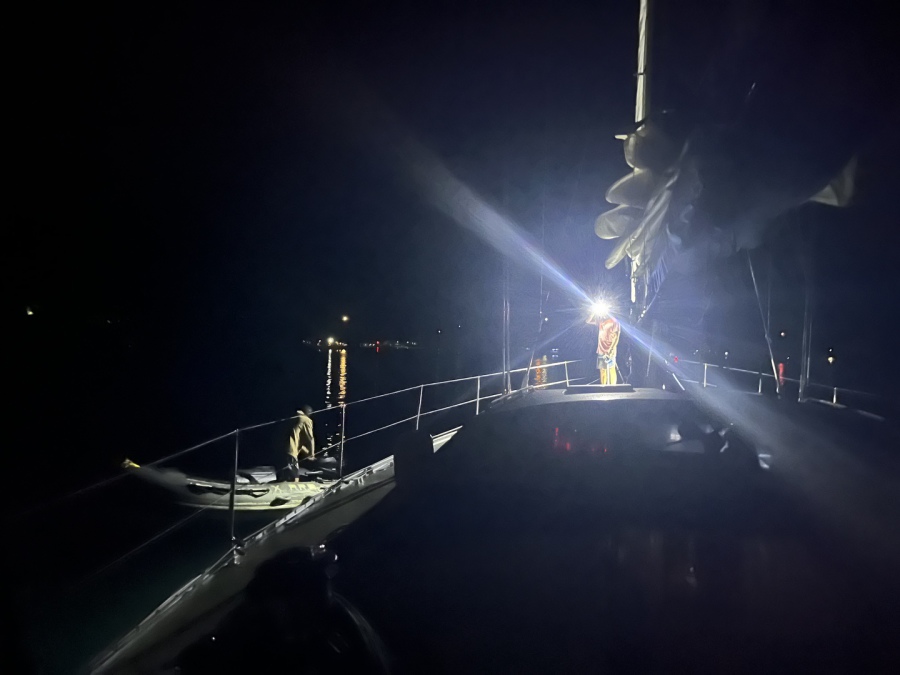 Notre voisin nous entend poser l’ancre et vient voir si nous avons un souci!!! À deux heures du matin c’est drôlement gentil!
