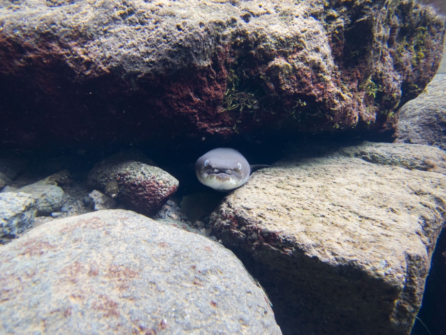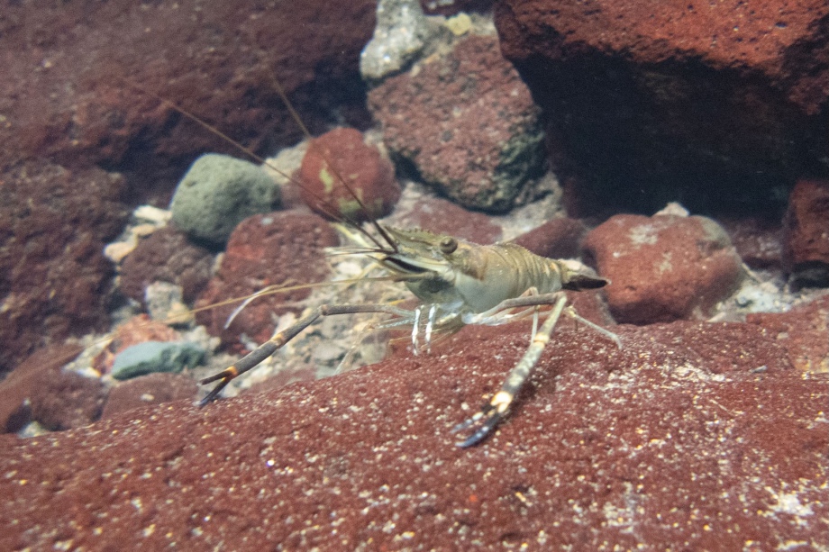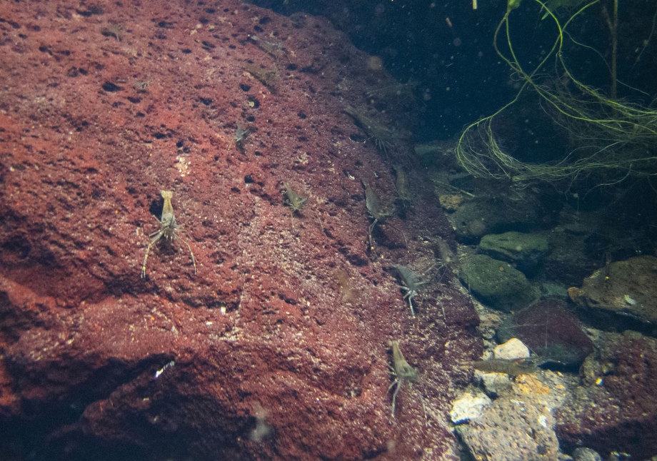 Rappelez-vous, c’est le magnifique puit d’eau avec une visibilité incroyable, sacré pour les polynésiens! Sacré pour moi car y habitent crevettes, poissons et anguilles aux yeux bleus! Je me régale à les observer! Les petites crevettes dressent leurs pinces pour défendre leur territoire! Quel courage face à ma grande taille!