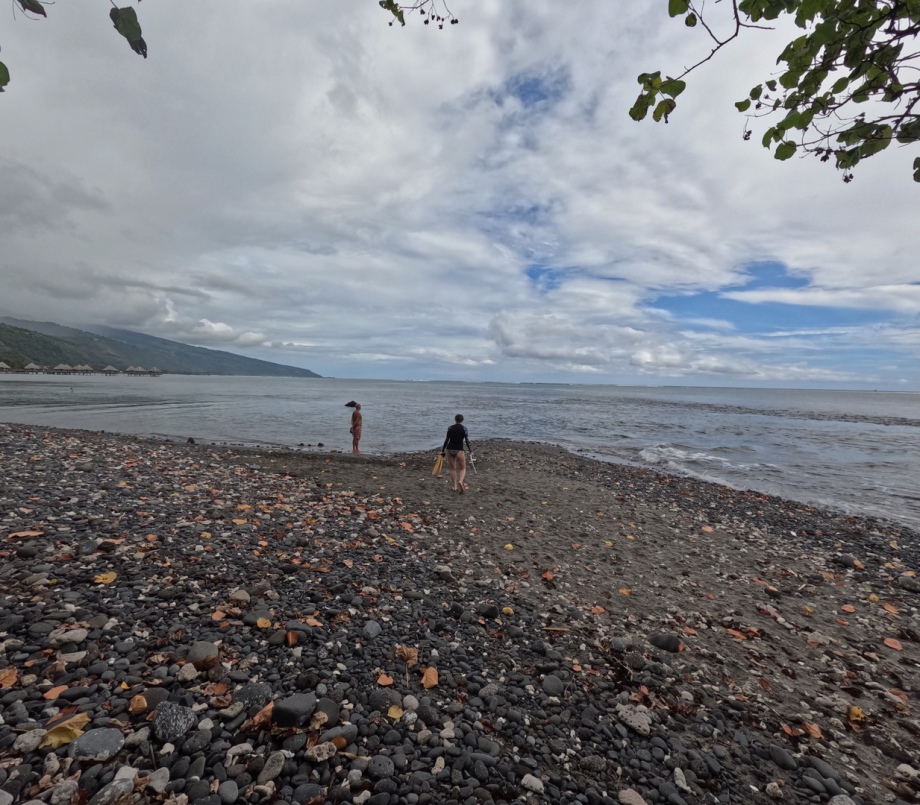 Après un petit resto bord de mer toujours sous un déluge, nous allons à la pointe des pêcheurs pour immerger Delphine dans le paradis marin de la Polynésie!