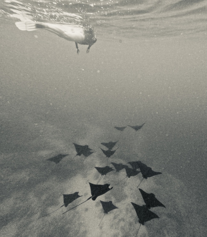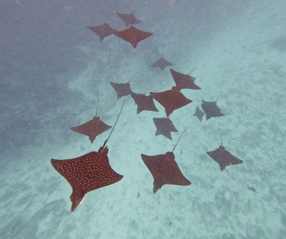 Et c’est peu de le dire: le magnifique banc de raies aigles est immense! Quelques tortues viennent tout prés! Des requins pointes blanches dorment sur le sable…Nous ne savons plus où donner de la tête!